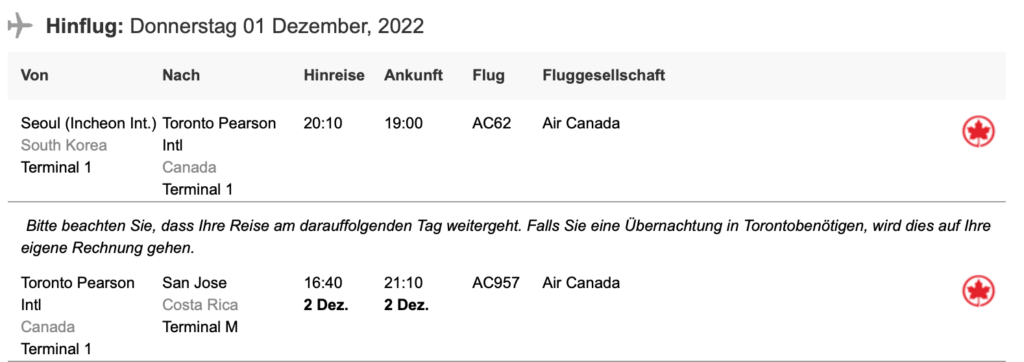 Trotz Verspätung meines Fluges (21:50), war ich schon um 17:15 am Flughafen. Gut war es. Da ich online nicht einchecken konnte, musste ich zum Schalter. Dann wusste ich auch warum. Ich hatte ein Ticket nach Toronto und am nächsten Tag weiter nach Costa Rica. Weitere Tickets hatte ich noch nicht. Das war das Problem. Man kann nicht nach Costa Rica einreisen ohne ein Ticket für eine Ausreise zu haben. Die Agentin meinte nur, wenn ich keine exakten Daten für die Ausreise habe, soll ich einen Flug mit Versicherung buchen und diesen dann in Costa Rica stornieren. Es entstehen dann nur die Stornierungskosten. Setzte mich mit meinen Laptop brav auf ein Bankerl und buchte einen Flug nach Hause. 15. Dezember mit 2 Zwischenstopps in nicht Impfpass verlangenden Ländern. Kanada und Deutschland. Mehr dazu wenn es soweit ist. Bravofly war mein Anbieter. Leider bekam ich keine Bestätigungsemail, was mich doch dann ein bisschen nervös machte. Die Zeit wurde schon knapp. Online Chat sagte mir, dass ich in Deutschland anrufen soll. Über Skype funktionierte es nicht. Vielleicht hatte ich zu wenig Guthaben? Wollte aufladen, aber kurz vor dem Abschluss von PayPal war wieder alles auf koreanisch. Meine Agentin vom Schalter verabschiedete sich von mir und übergab mich ihrer Kollegin. Voll nett. Da ich immer wieder Kontakt zur netten Dame am Schalter hatte, versuchte diese in Deutschland bzw. Österreich anzurufen. Erfolglos !!! Sie telefonierte parallel auch mit ihrem Manager. Der sah, dass ich den Flug gebucht hatte. Ohne einer Email Bestätigung konnte ich dann einchecken. Habe bis zum Abflug keine Email bekommen. Wechselte noch die übrig gebliebenen Won in Kanadische Dollar um und war um 20:30 bei meinem Gate. Mehr als 3 Stunden gingen dafür drauf. 21:50 hoben wir dann Richtung Toronto ab. 12:48 Stunden später landeten wir auch schon am Pearson Airport. Es war noch immer der gleiche Tag nur 1 Stunde früher. Etwa um 21:00 verließ ich nach den Kontrollen den Flughafen. Dürfte bei der elektronischen Einreise angeklickt haben, dass ich Alkohol oder Zigaretten mit habe. Dem schwarzen Typ hinter der Scheibe musste ich dann Rede und Antwort stehen. Wo komme ich her, warum habe ich diesen Flug genommen, kennen sie jemanden in Kanada, wo wohnen sie hier, was machen sie hier, waren sie schon einmal in Kanada warum habe sie angegeben, dass sie Alkohol bzw. Zigaretten mitbringen usw. Ich schaffte auch dieses und war dann auf kanadischem Territorium. Ließ am Wechselschalter noch Kleingeld für den Bus wechseln, da im Bus der exakte Betrag bezahlt werden muss. Von der Unterkunft hatte ich die perfekte Beschreibung zur Anreise bekommen. 3,25 Kanadische Dollar war der Salär. 3 Dollar warf ich beim Bus ein. War ok 😂. Ticket gültig für eine Richtung. Etwa 1 Stunde Fahrzeit mit 3 Verkehrsmitteln. Einchecken im 6 Bettzimmer und 3 Bier in einem nahen Pub. Gute Nacht !